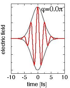 E(t) = E0(t) cos(ωt+φ) . ω is the laser (circular) frequency which corresponds to an oscillation period of 2.6 fs at the common wavelength of 800 nm of current femtosecond lasers. Choosing the convention that t=0 at the maximum of the pulse envelope E0, an absolute phase φ=0 leads to "cosine-like" pulses (peak of the field at t=0), whereas φ=-π/2 leads to "sine-like" pulses (zero field strength at t=0). |