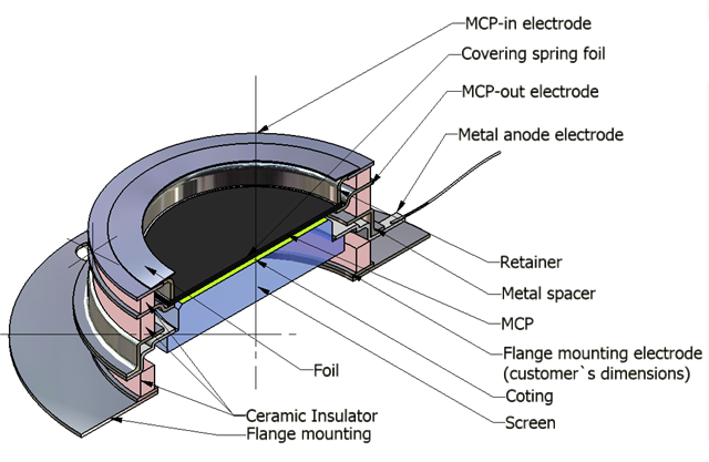 The body of assembly is a metal-ceramic housing. Drawing shows two matched MCPs in V-stack (Chevron) assembly, which are fixed in place using retainer ring (above MCPs). Ceramic insulator rings are shown red. Detector is spot-welded to the support plate (available in different sizes). |